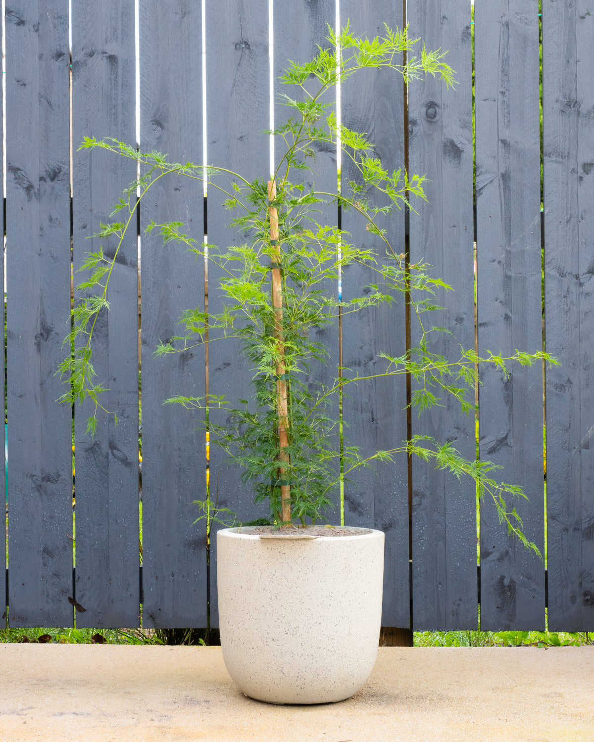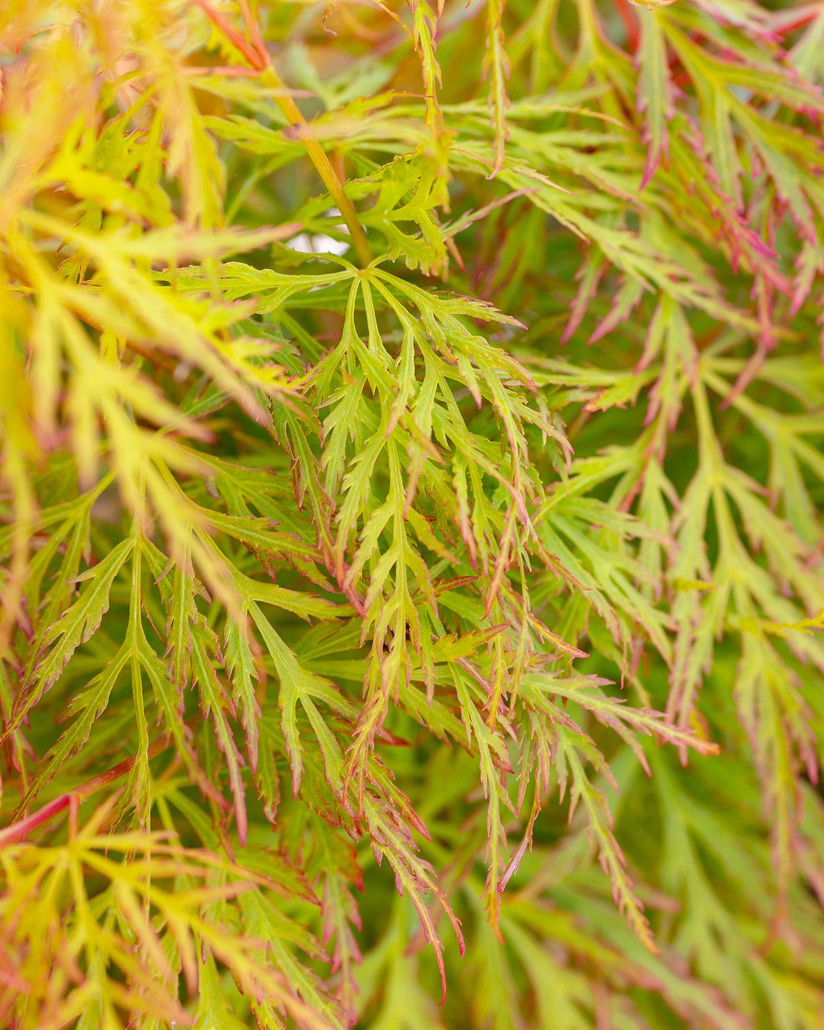 The Emerald Japanese Maple, scientifically known as Acer palmatum Emerald Lace, is a striking outdoor tree prized for its finely cut, lace-like leaves. This variety stands out with its vibrant emerald green foliage that gracefully drapes from its branches, creating a cascading effect that adds elegance and movement to any garden space.