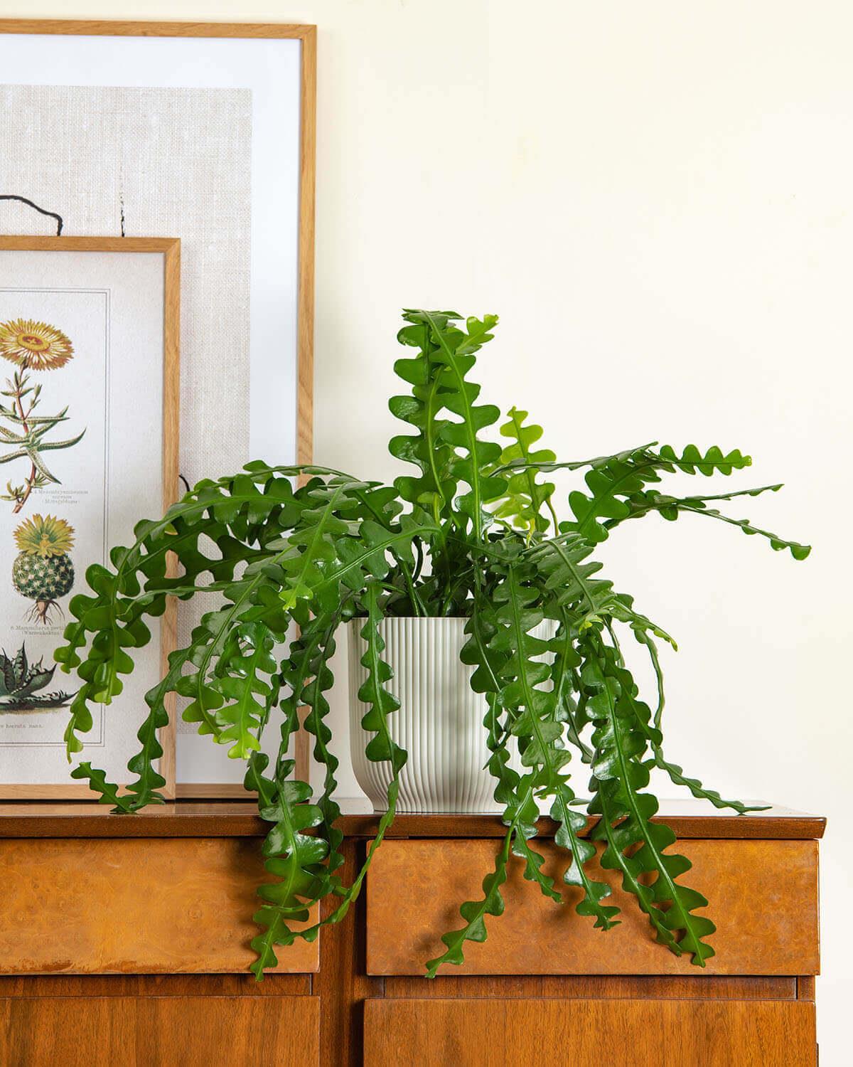 Your cactus also likes a little misting and if it isn't humid enough its roots may begin to show. As Fishbone Cactus leaves grow downwards, this tall plant looks great on a high shelf or hanging basket so they can trail down to their full potential of 2m long. If you don't have the space for this trailing plant, you can trim it to your desired length. Be warned, this is a heavy plant so make sure your pot (and walls) can accommodate it!
