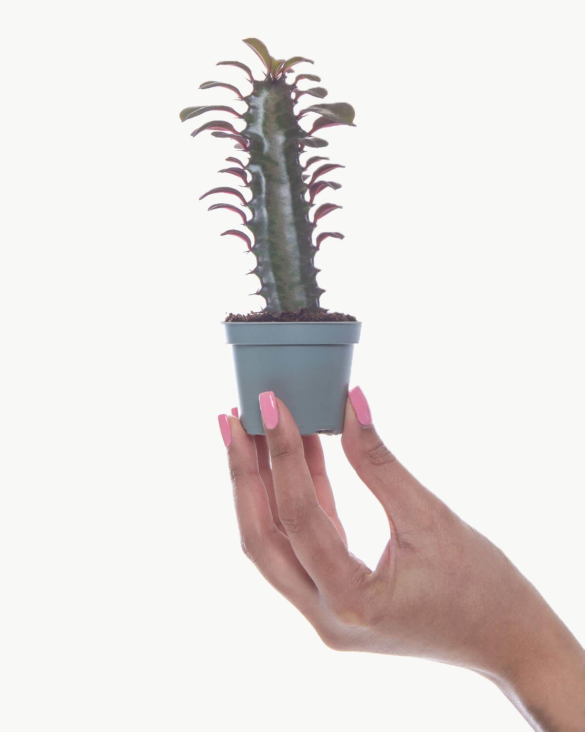 Like most cacti and succulents, the baby African Milk Tree loves a warm, dry environment (15-27°C), making your living room or bedroom the ideal home. Keep it in bright, indirect sunlight and water only when the soil is dry. Your prickly plant will let you know when it needs more water by dropping some of its leaves.