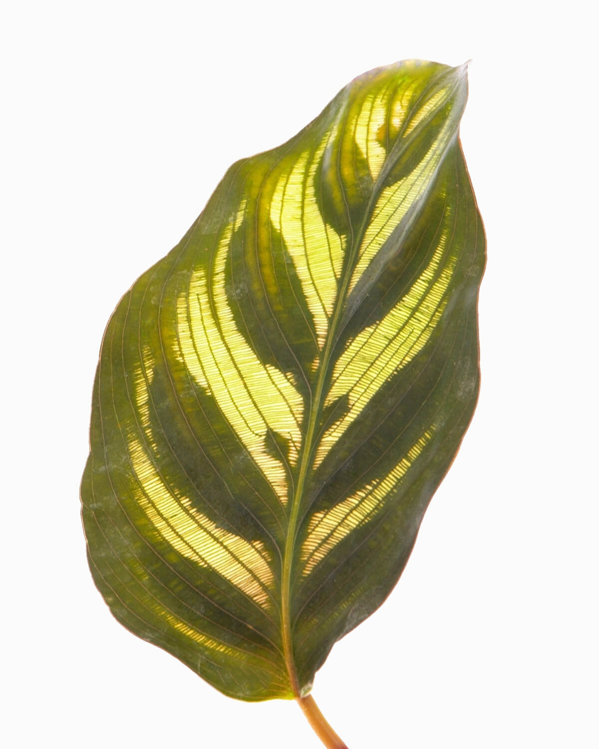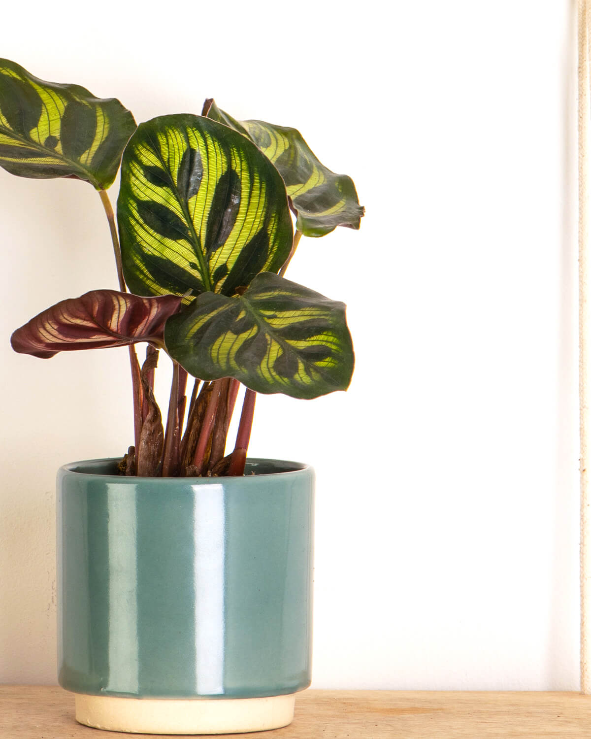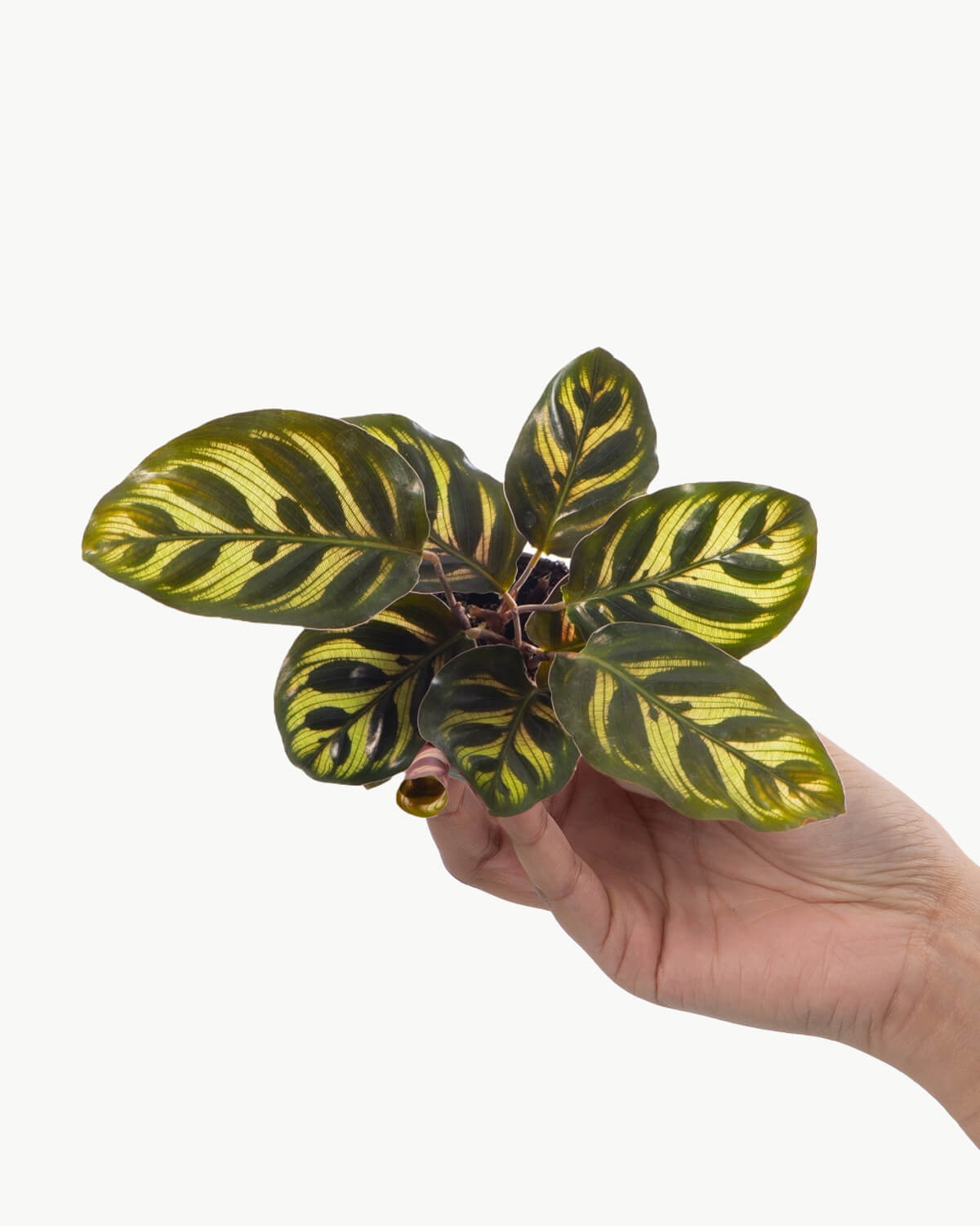 The Lil' Makoyana Prayer Plant is nicknamed the Peacock Plant thanks to its stunning patterned foliage. Its leaves resemble the eye-catching feathers in a peacock's tail. Add a touch of elegance to your home with the regal Lil' Makoyana. Unlike a real peacock, your Lil' Peacock Plant doesn't need to live in acres of sprawling gardens - it's happiest indoors with a small spot in bright, indirect sunlight in your bedroom, living room, hallway, or office.