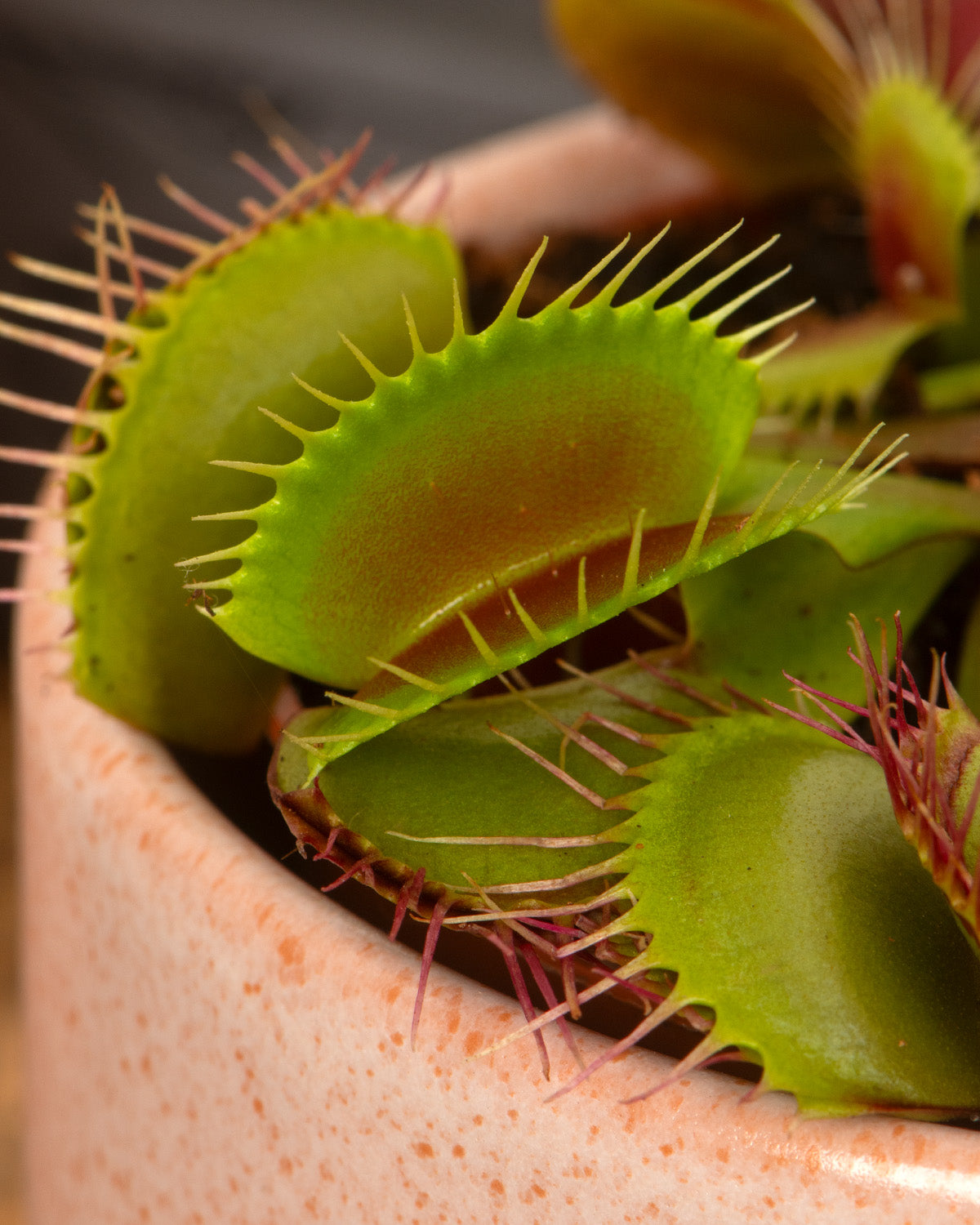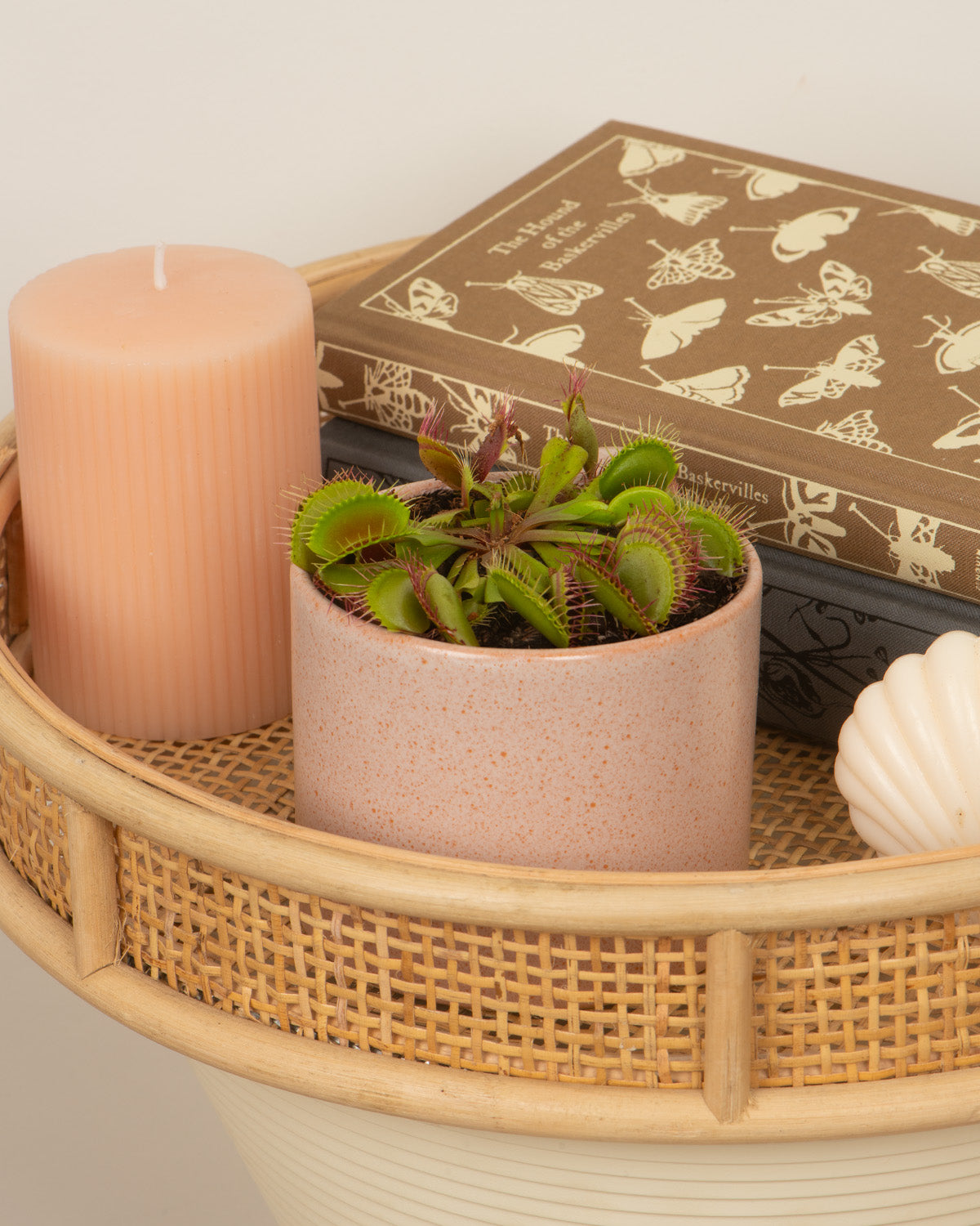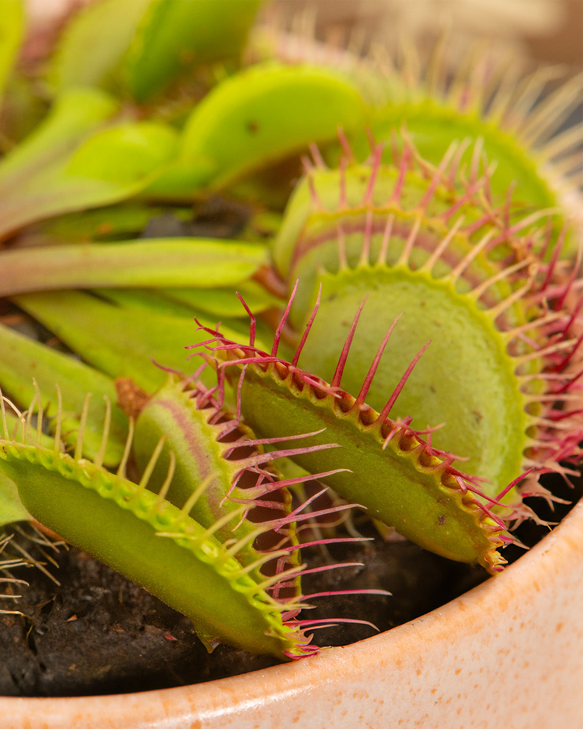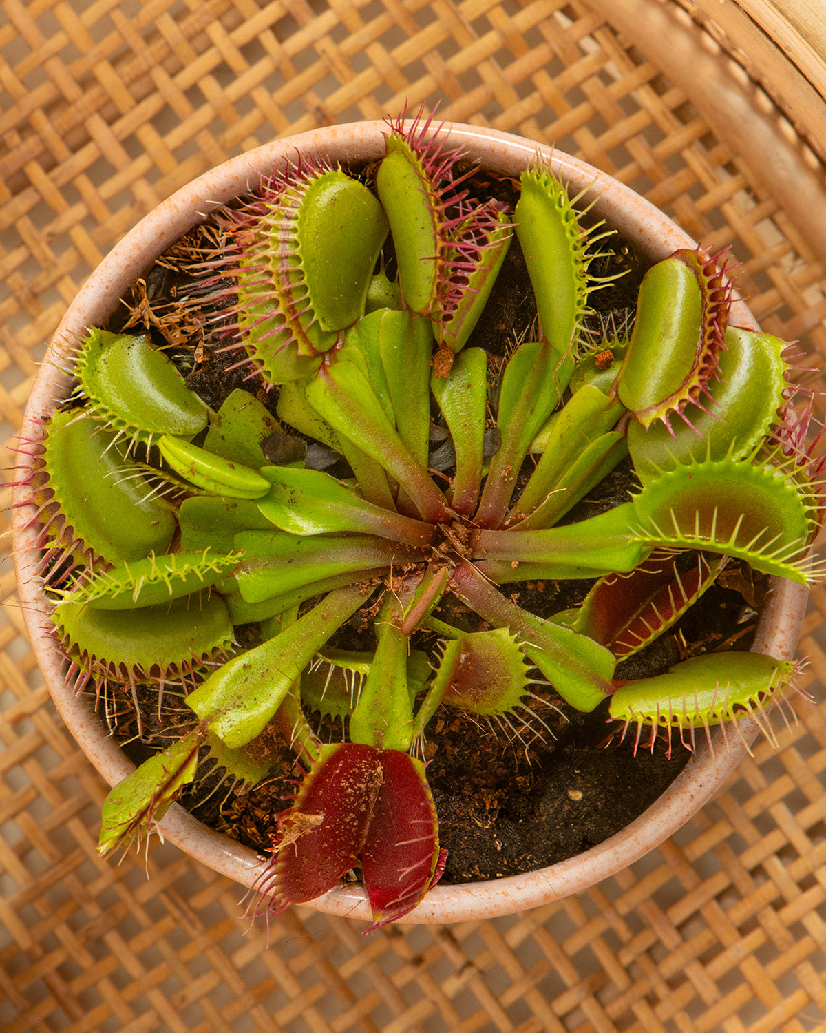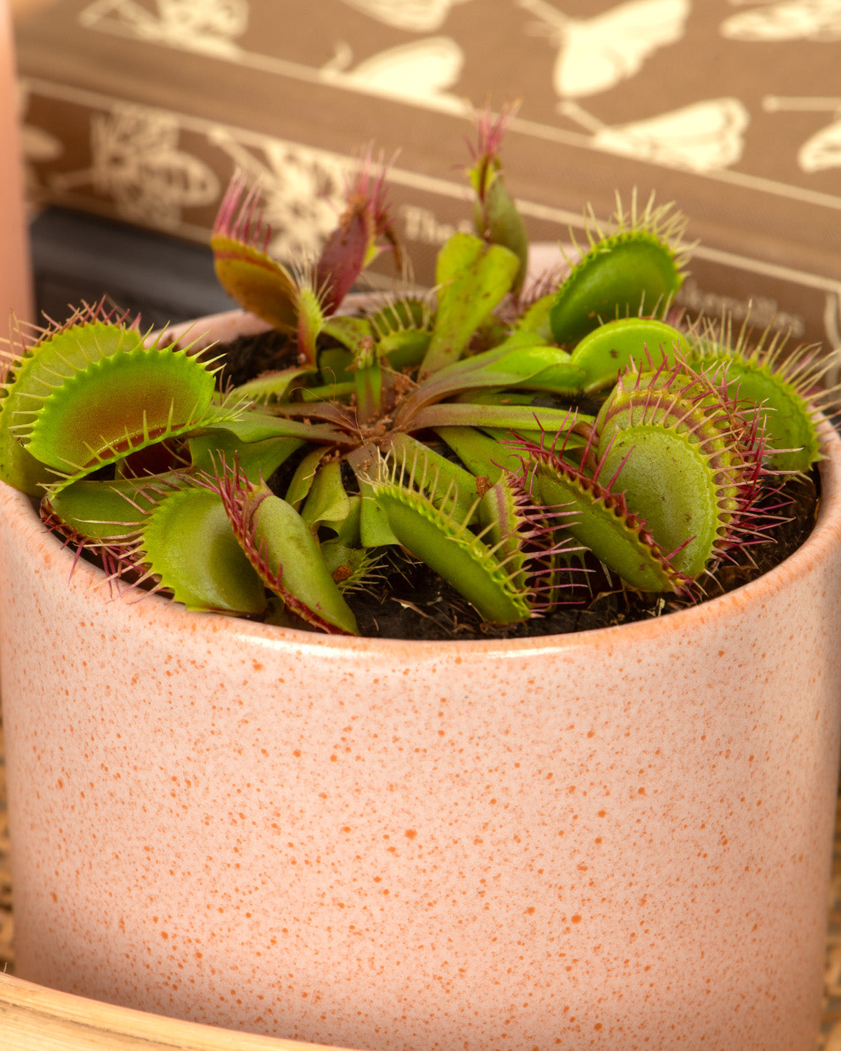 Venus Flytraps thrive in bright, indirect sunlight and love high humidity, making them a great plant for bathrooms or kitchens. They are happiest in nutrient-poor soil and prefer distilled or rainwater over tap water. Keep the soil consistently moist but avoid waterlogging. Your Venus Fly Trap enjoys a warm environment, with temperatures ranging from 20-30°C, and can tolerate slight drops in temperature at night.