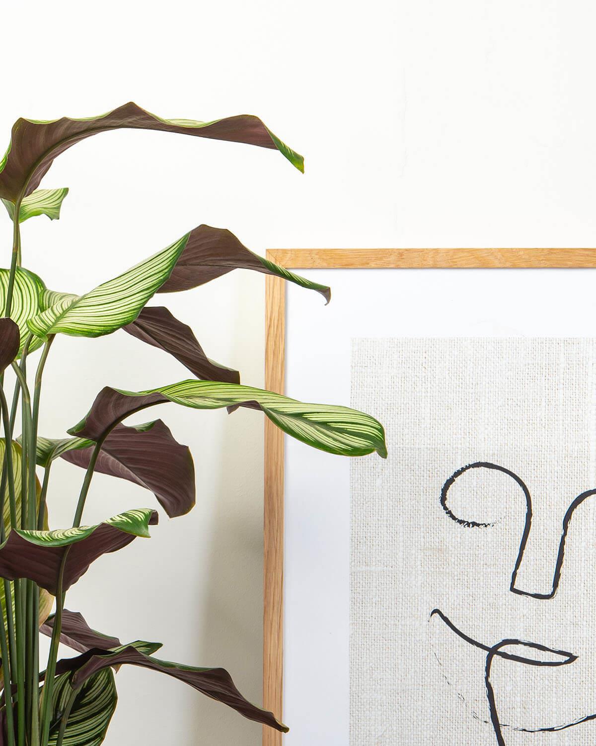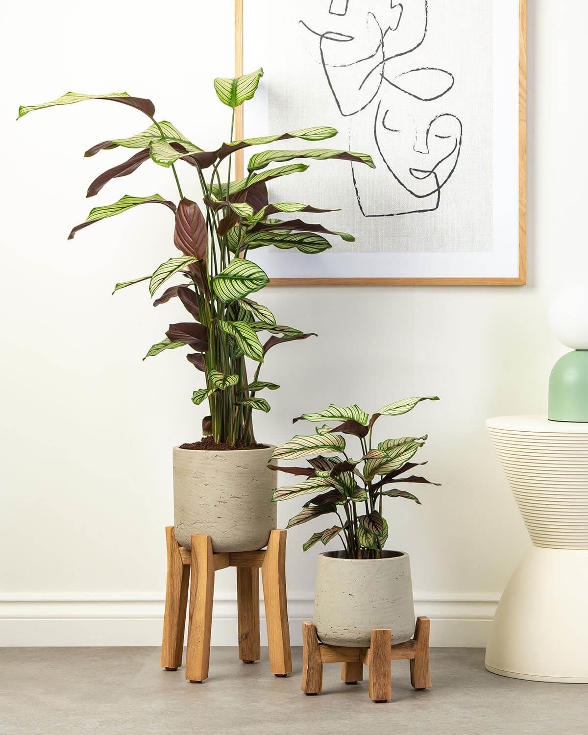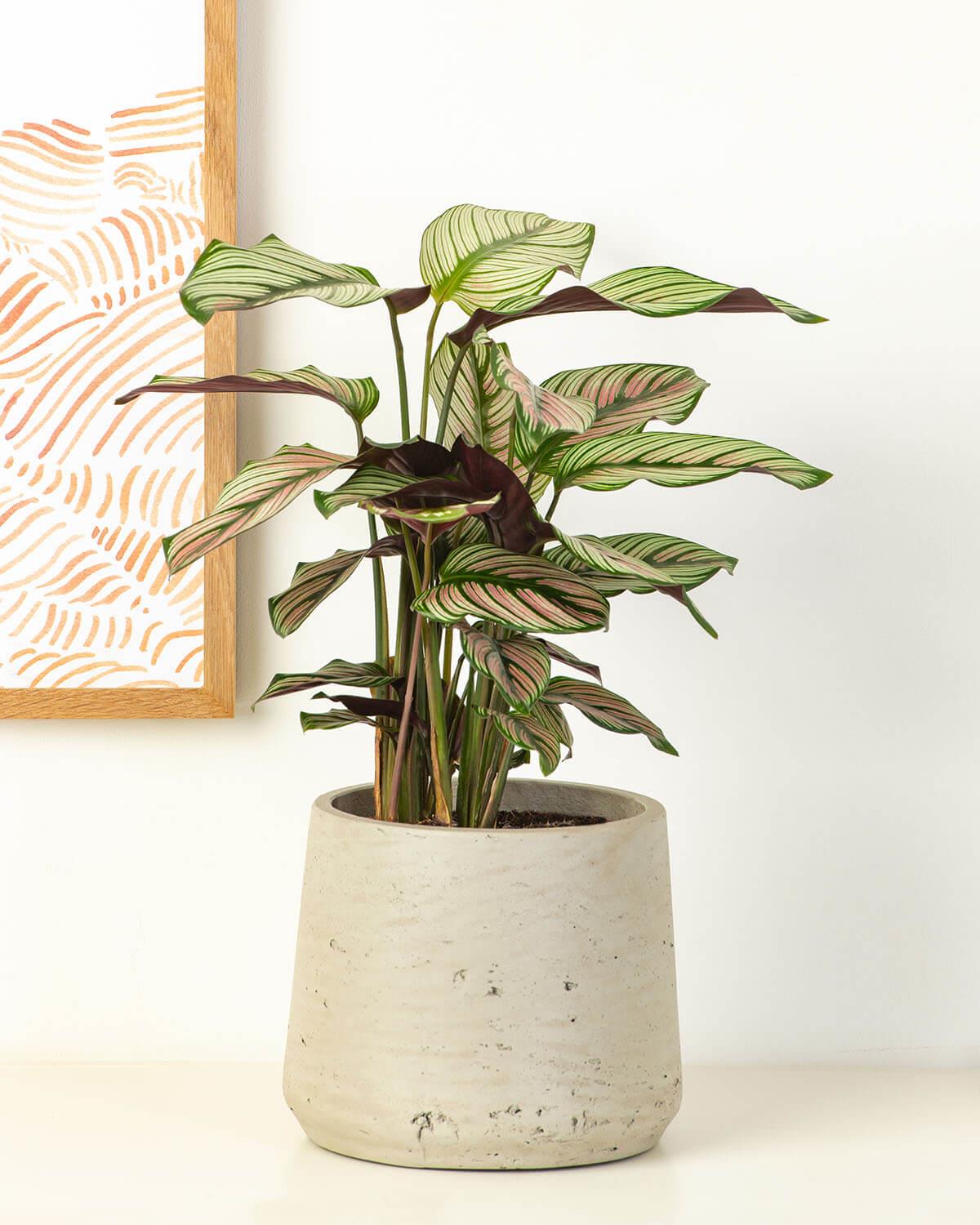 This fast-growing (height of up to 1.5m) beauty is the perfect houseplant, as caring for your Calathea White Star isn't too complicated either. Keep them in indirect sunlight, and regularly water and mist them. Crisping leaves need more humidity, curling ones need more water, and drooping ones need more mist. Our top Calathea care tip is to use half of the recommended feed amount as their roots burn easily.